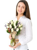 Masumiyetin ve saflığın sembolü olan beyaz güller, cam vazo içerisinde zarif bir aranjman olarak sunuluyor. 15 adet beyaz gül, mor dekoratif çiçeklerle zenginleştirilerek göz alıcı bir görünüm kazanıyor. Şıklığı ve sadeliği bir arada sunan bu aranjman; düğün, nişan, yıldönümü gibi özel günler veya sevdiklerinize içten duygularınızı iletmek için ideal bir seçimdir.