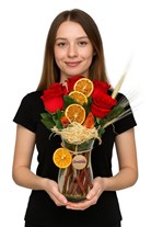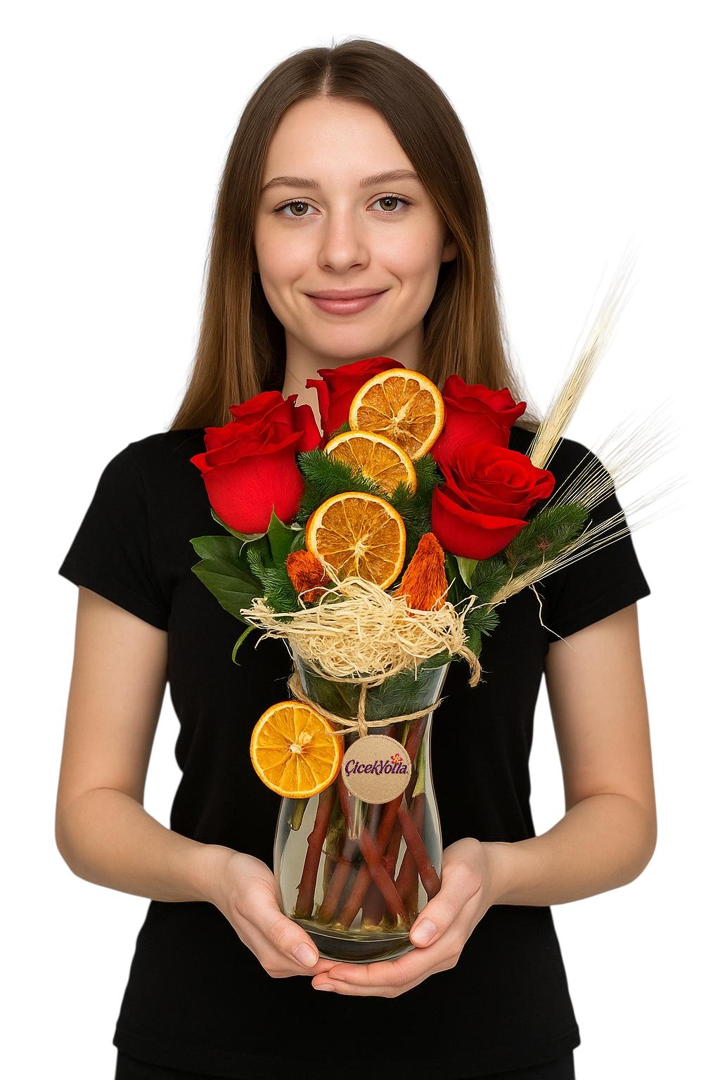 Tutkunun simgesi kırmızı güller, cam vazo içerisinde doğal detaylarla buluşuyor. 7 adet kırmızı gül, kurutulmuş portakal dilimleri, buğday başakları ve yeşil yapraklarla harmanlanarak modern ve etkileyici bir aranjman oluşturulmuştur. Romantik anlamının yanı sıra doğal görünümüyle dikkat çeken bu tasarım, sevdiklerinize unutulmaz bir hediye alternatifi sunar.
