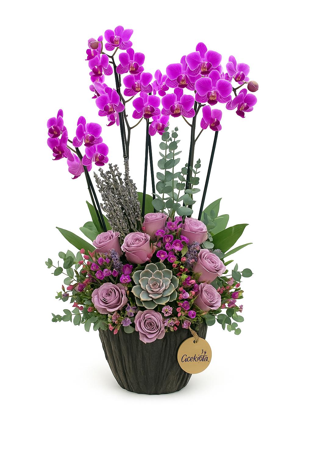 Altı dallı canlı mor Phalaenopsis orkide, zarif lila tonlarında güller, lavanta dalları, naturel okaliptus yaprakları ve etli dokulu yeşil sukulentler… Hepsi özenle yerleştirilmiş şık koyu seramik saksı içerisinde harmanlanarak hem gösterişli hem de modern bir bütünlük oluşturuyor. Aranjman, Çiçek Yolla logolu kraft etiketle detaylandırılmıştır.