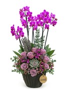 Bu şık aranjman, özellikle doğum günü, evlilik yıldönümü, yeni iş tebriği, kutlama veya kurumsal hediye için mükemmel bir tercihtir. Uzun ömürlü orkidelerle birlikte sukulentlerin ve lila güllerin bir araya gelmesi, kalıcı bir etki yaratır. Zarafeti ve kalıcılığı bir araya getiren bu tasarım, bulunduğu her ortamı zenginleştirir.