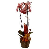 İki dallı Phalaenopsis pembe orkide, büyüleyici çiçekleriyle bulunduğu ortama romantik, zarif ve etkileyici bir atmosfer katarken, kurutulmuş süslemeler ve tropikal dokularla benzersiz bir bütünlük sunar.