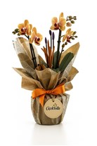 Doğanın zarafeti ve baharın sıcak renkleri bir arada: Bahar Esintisi Orkide Aranjmanı . Turuncu ve sarı tonlarındaki çift dal Phalaenopsis orkidesi, şık doğal ambalajı ve dekoratif aksesuarlarıyla benzersiz bir tasarım sunuyor. Kuru tarçın çubukları, lavanta ve haşhaş kapsülleriyle zenginleştirilmiş bu aranjman, yaşam alanlarınıza ferahlık ve zarafet katar.