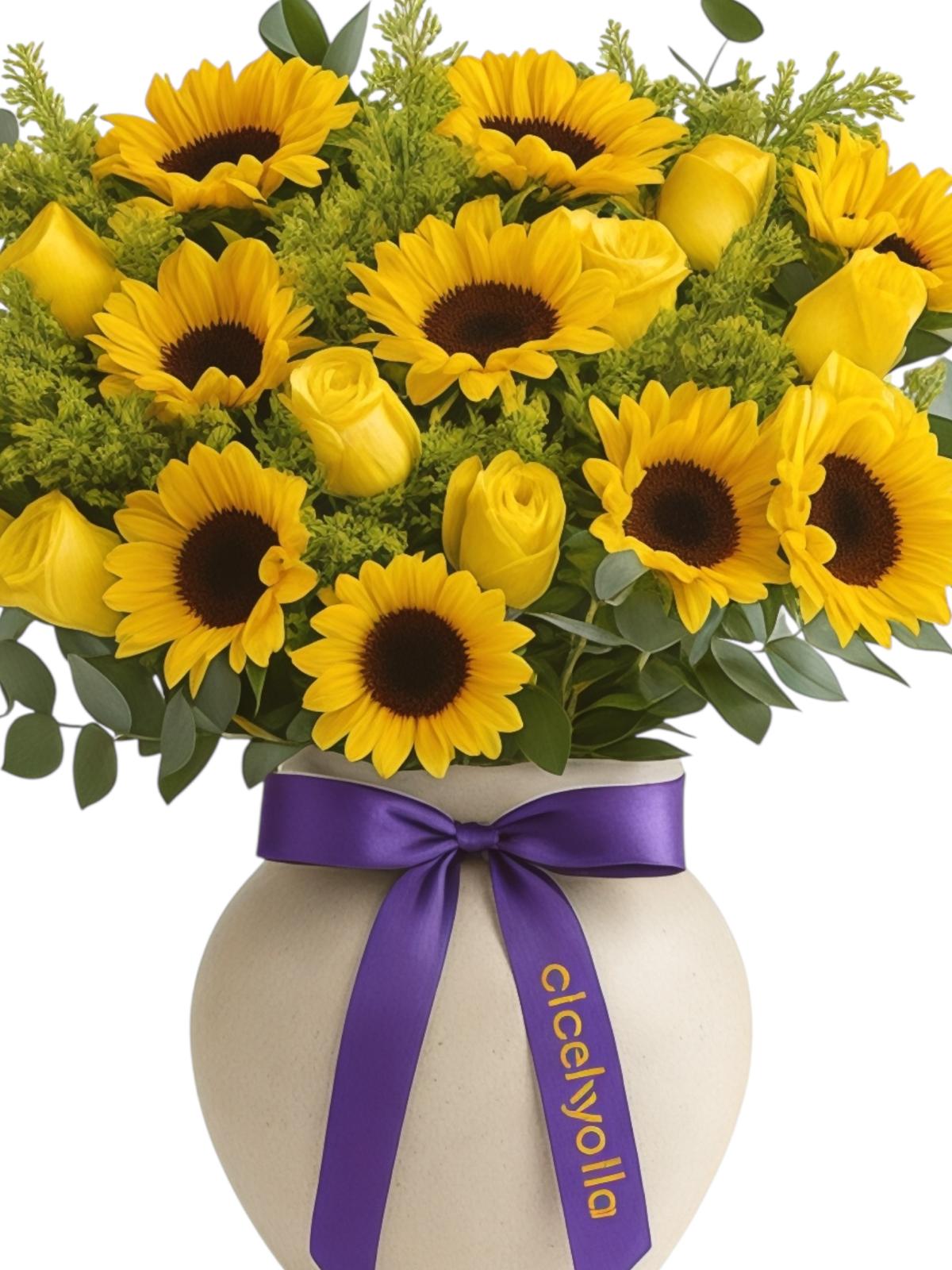 Işıltısıyla mutluluk saçan “Güneş Işığı” aranjmanı, enerjiyi ve neşeyi temsil eden ayçiçekleriyle sarı gülleri bir araya getiriyor. Parlak sarının tüm pozitif enerjisini yansıtan bu özel tasarım, solidago çiçekleri ve eukaliptus yapraklarıyla zenginleştirilmiştir. Krem tonlu doğal seramik vazo içerisinde, mor “çiçekyolla” logolu saten kurdeleyle tamamlanan bu aranjman; özel günlerde sevdiklerinize canlılık ve mutluluk taşımak için ideal bir seçimdir.