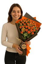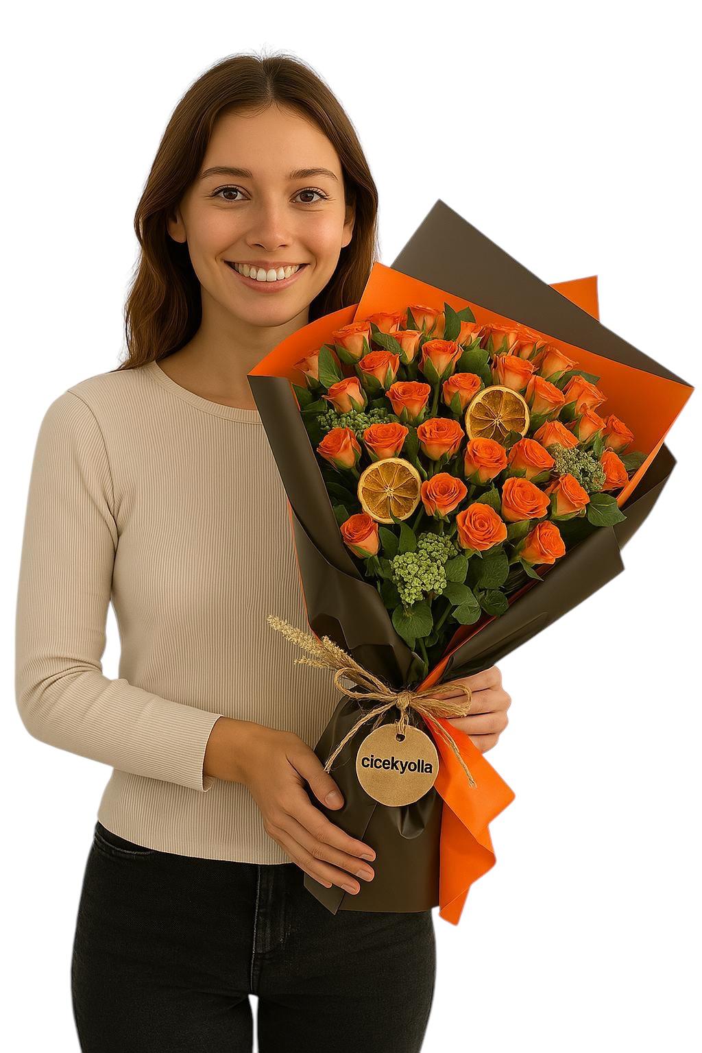 Canlılığı ve sıcaklığı temsil eden turuncu güllerle hazırlanan bu özel buket, sadece bir çiçek değil; aynı zamanda enerjik bir ruh halinin, içten dileklerin ve samimi bir tebessümün temsilcisidir. 21 adet capcanlı turuncu gül, okaliptüs yaprakları, lavanta ve dekoratif yeşillikler ile harmanlanarak hazırlanmıştır. Kuru portakal dilimleriyle taçlandırılmış bu tasarım, doğallığın modern şıklıkla buluştuğu eşsiz bir hediyeye dönüşüyor.