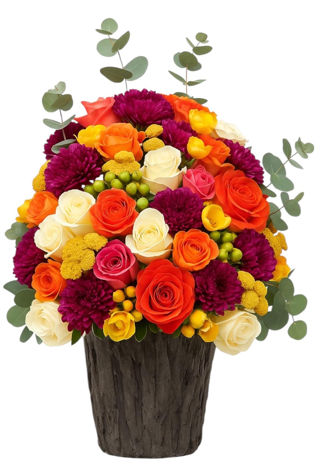 Ürün Yüksekliği 35cm O'na hayallerini süsleyecek bir sürpriz yapmaya ne dersiniz? Beton Saksı Görünümlü Saksı içerisinde turuncu çardak güller, lila güller, yeşil biçmeler, crassula rubertis, hypericum ve ile tasarlanmış Monica, tarifsiz mutluluklar yaşatacak.