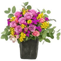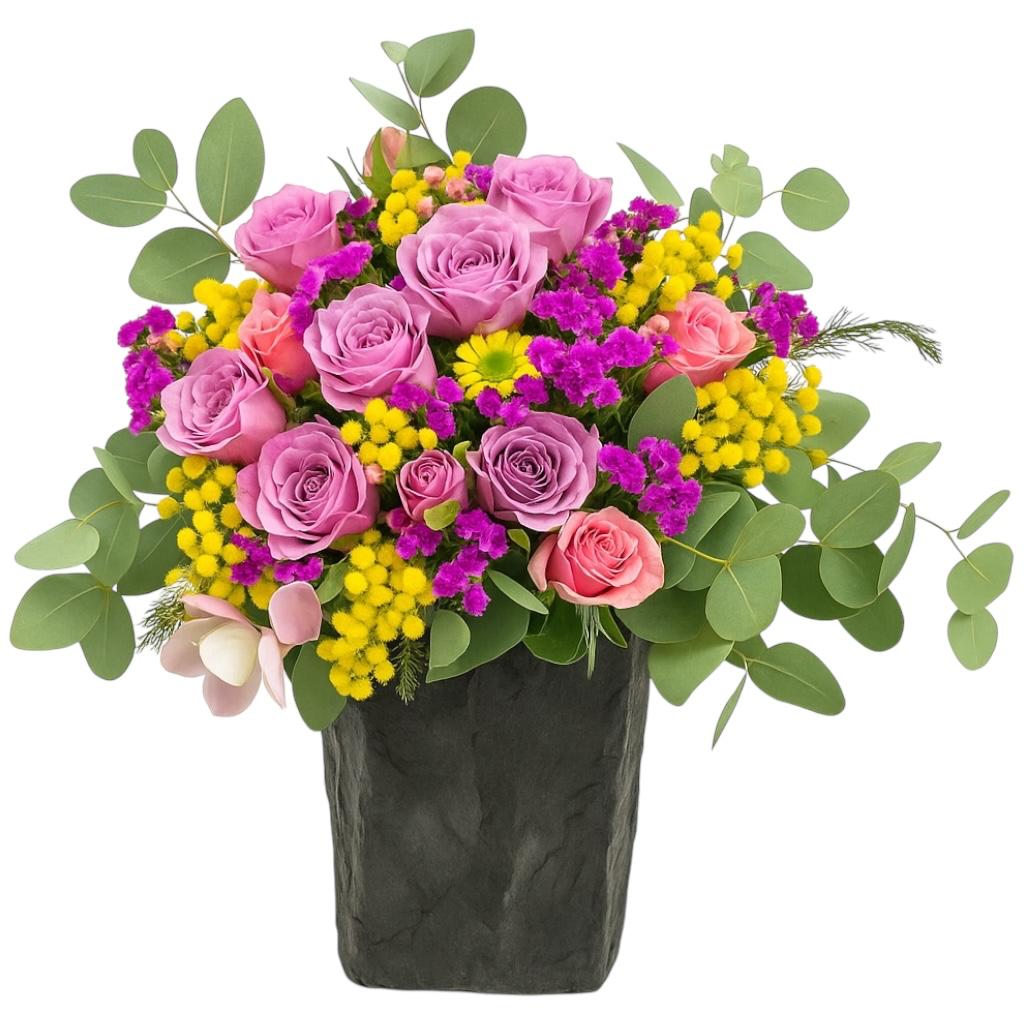 Ürün Yüksekliği 35cm O'na hayallerini süsleyecek bir sürpriz yapmaya ne dersiniz? Beton Saksı Görünümlü Saksı içerisinde turuncu çardak güller, lila güller, yeşil biçmeler, crassula rubertis, hypericum ve ile tasarlanmış Bella, tarifsiz mutluluklar yaşatacak.