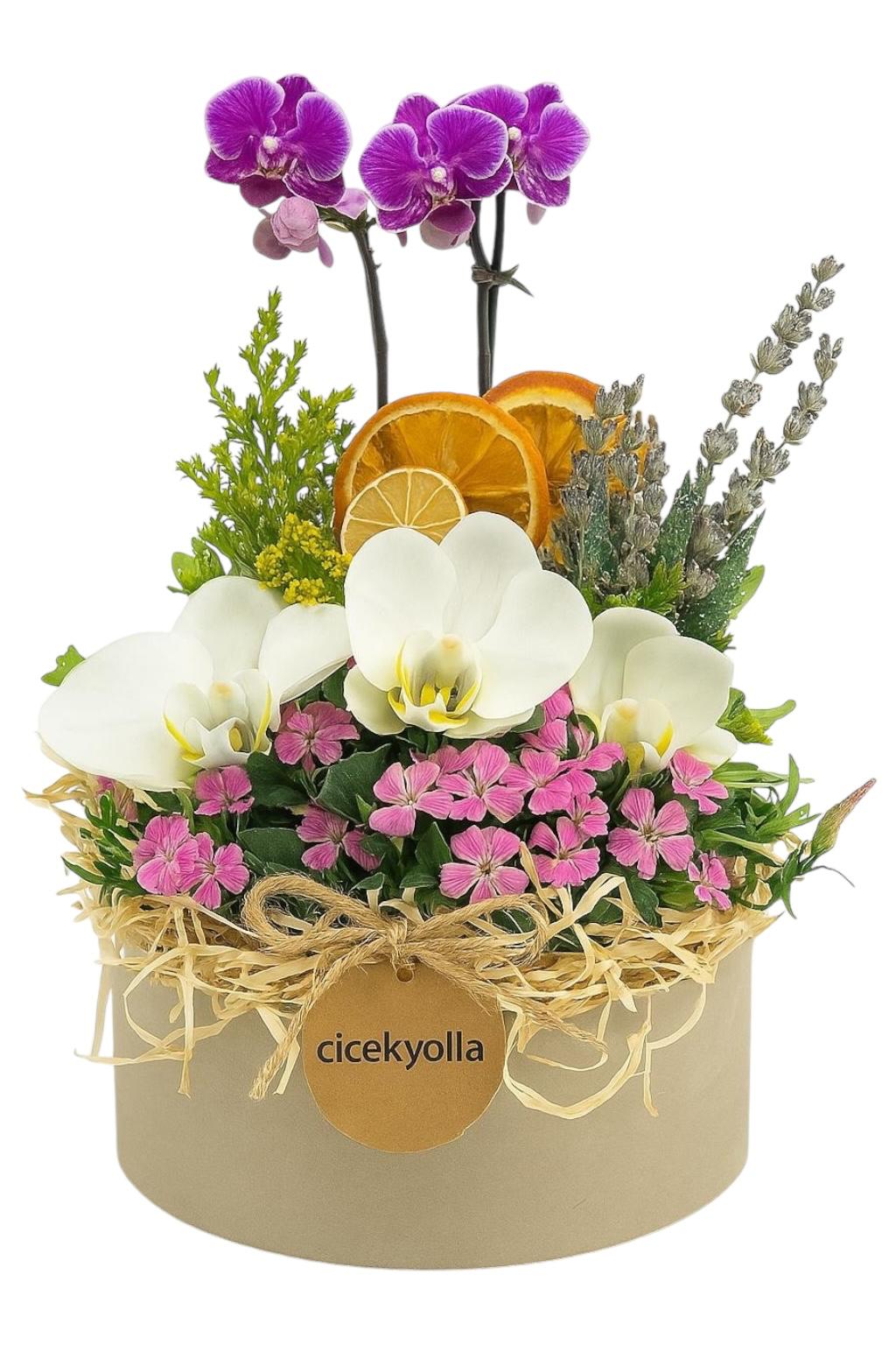 Doğallık ve zarafet bir arada: “Orkide Işıltısı” aranjmanı, mor ve beyaz Phalaenopsis orkide çiçeklerinin eşsiz uyumunu, pembe Kalanchoe ve lavanta gibi kuru detaylarla tamamlıyor. Kurutulmuş portakal dilimiyle sıcak bir dokunuş kazanan bu aranjman, sade ve şık bej beton saksı içerisinde sunuluyor.