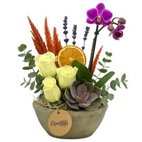 Doğanın sakin ve şık tonlarının modern bir sunumla buluştuğu “Lavanta Bahçesi” aranjmanı, doğal dokulu beton saksı içerisinde göz alıcı bir kompozisyon sunuyor. Üç adet krem tonlu zarif gül, mini mor orkide dalı, lavanta sapları, turuncu kuru başaklar, yeşil okaliptus yaprakları ve bir adet etli yapraklı sukulentle zenginleştirilmiş bu tasarım; hem doğal hem de estetik görünümüyle dikkat çeker. Kurutulmuş portakal dilimi, aranjmana ferah ve sanatsal bir dokunuş katarken; rustik bağ detaylı Çiçek Yolla etiketi, sunumun özgünlüğünü tamamlar.