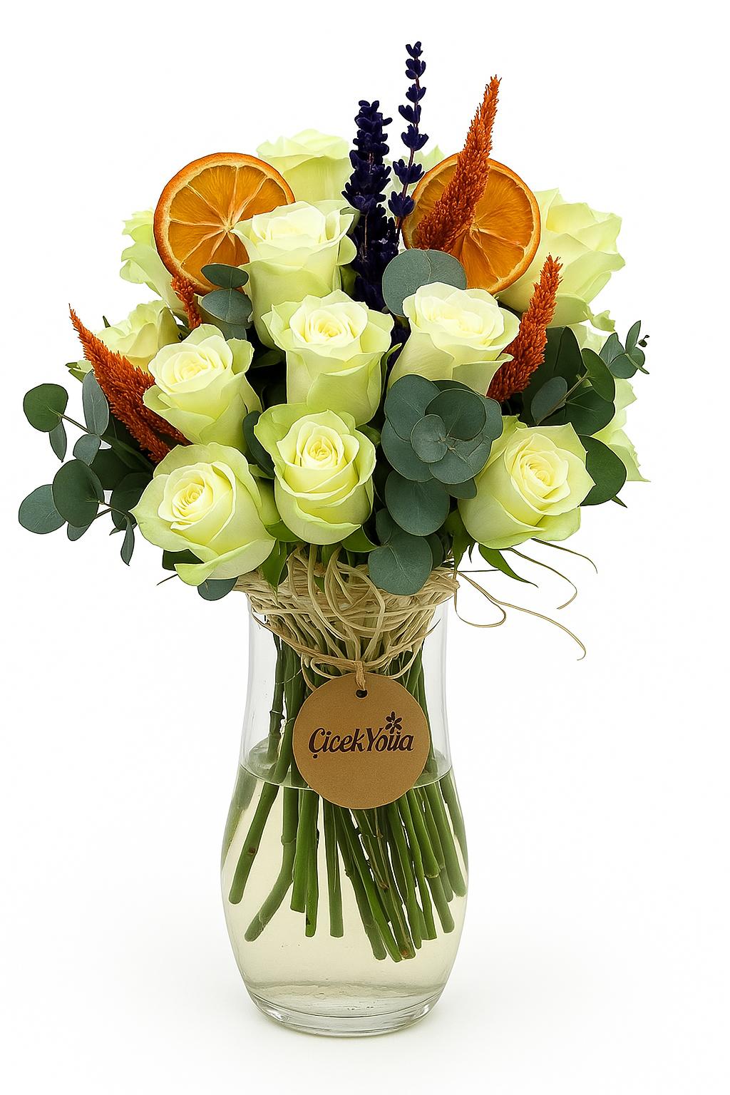 Zarafetin doğallıkla buluştuğu bu şık aranjman, cam vazo içinde özenle hazırlanmış 13 adet krem gül ile sade ama etkileyici bir sunum sunuyor. Aranjmanı tamamlayan kurutulmuş lavanta dalları, turuncu lagurus başakları, dilimlenmiş kuru portakal ve eukaliptus yaprakları; hem görsel zenginlik hem de doğal bir atmosfer katıyor. Vazonun ağız kısmı naturel rafya ile süslenmiş ve Çiçek Yolla'nın doğal ipli yuvarlak etiketiyle detaylandırılmıştır. Göz alıcı ama gösterişsiz bu aranjman; özel günler, teşekkürler ve anlamlı jestler için mükemmel bir seçimdir.