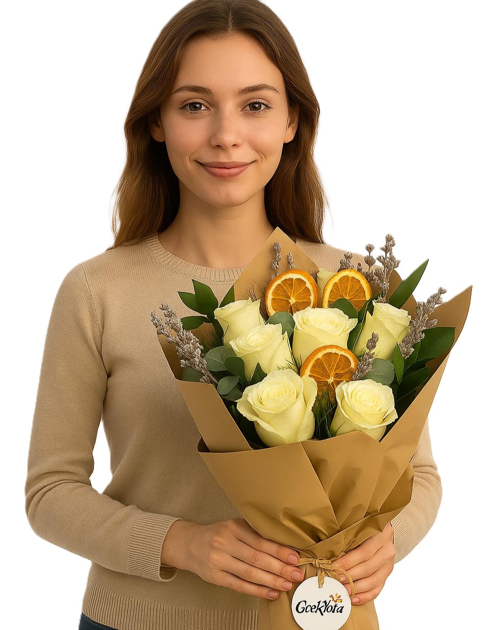 Bu zarif beyaz gül buketi, şıklığı ve doğallığı bir arada sunuyor. 7 adet taze beyaz gül, doğal lavanta dalları ve yeşil okaliptüs yaprakları ile tamamlanarak göz alıcı bir tasarım oluşturulmuş. Kuru portakal dilimleriyle süslenen bu buket, modern bir dokunuşla geleneksel zarafeti birleştiriyor.