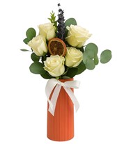 Zarafetin ve doğallığın bir araya geldiği “Lavanta Esintisi”, 6 adet beyaz gülün büyüleyici güzelliğini lavanta dallarının huzur veren kokusuyla buluşturuyor. Eukaliptus yapraklarının ferahlatıcı yeşilliği ve kurutulmuş portakal dilimlerinin rustik dokusuyla tamamlanan bu özel aranjman, canlı turuncu seramik vazo içerisinde sunuluyor. Beyaz kurdele detayıyla şıklığı vurgulanan bu aranjman, sevdiklerinize olan sevginizi en zarif haliyle ifade etmenizi sağlar.