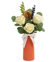 Şıklığı ve zarafetiyle dikkat çeken bu özel aranjman, krem beyaz güllerin asil duruşu, lavantanın huzur veren kokusu ve kurutulmuş portakal dilimlerinin doğal dokusuyla hazırlanmıştır. Eukaliptus yapraklarının yeşil tonlarıyla zenginleştirilen aranjman, modern krem tonlu vazo içinde sunulmakta ve beyaz kurdele ile tamamlanmaktadır. Sevdiklerinize hem zarif hem de kalıcı bir hediye sunmak için mükemmel bir seçimdir.