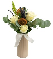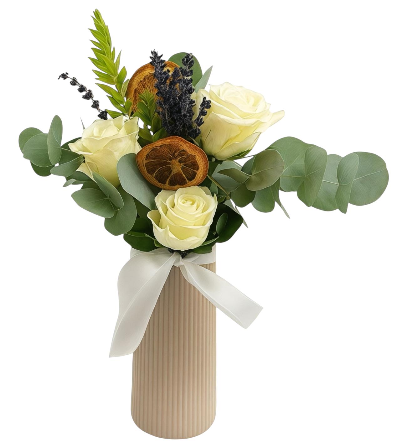 Şıklığı ve zarafetiyle dikkat çeken bu özel aranjman, krem beyaz güllerin asil duruşu, lavantanın huzur veren kokusu ve kurutulmuş portakal dilimlerinin doğal dokusuyla hazırlanmıştır. Eukaliptus yapraklarının yeşil tonlarıyla zenginleştirilen aranjman, modern krem tonlu vazo içinde sunulmakta ve beyaz kurdele ile tamamlanmaktadır. Sevdiklerinize hem zarif hem de kalıcı bir hediye sunmak için mükemmel bir seçimdir.
