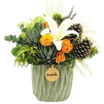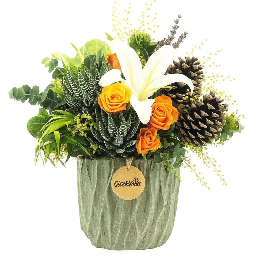 Modern tasarımın anlayışıyla doğanın en güzel detaylarını bir araya gelen bu çiçek aranjmanı, ona yaşatılan kendine hayran bırakıyor. Beyaz lilyumların zarafeti ve turuncu güllerin sıcaklığı, sukulentlerin egzotik dokusuyla buluşarak mükemmel bir uyum sağlıyor. Lavanta dalları ve çam kozalaklarının parçalarının oluşturduğu bu tasarım, doğanın eşsiz çeşitliliğini yaşam alanlarınıza taşıyor.