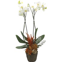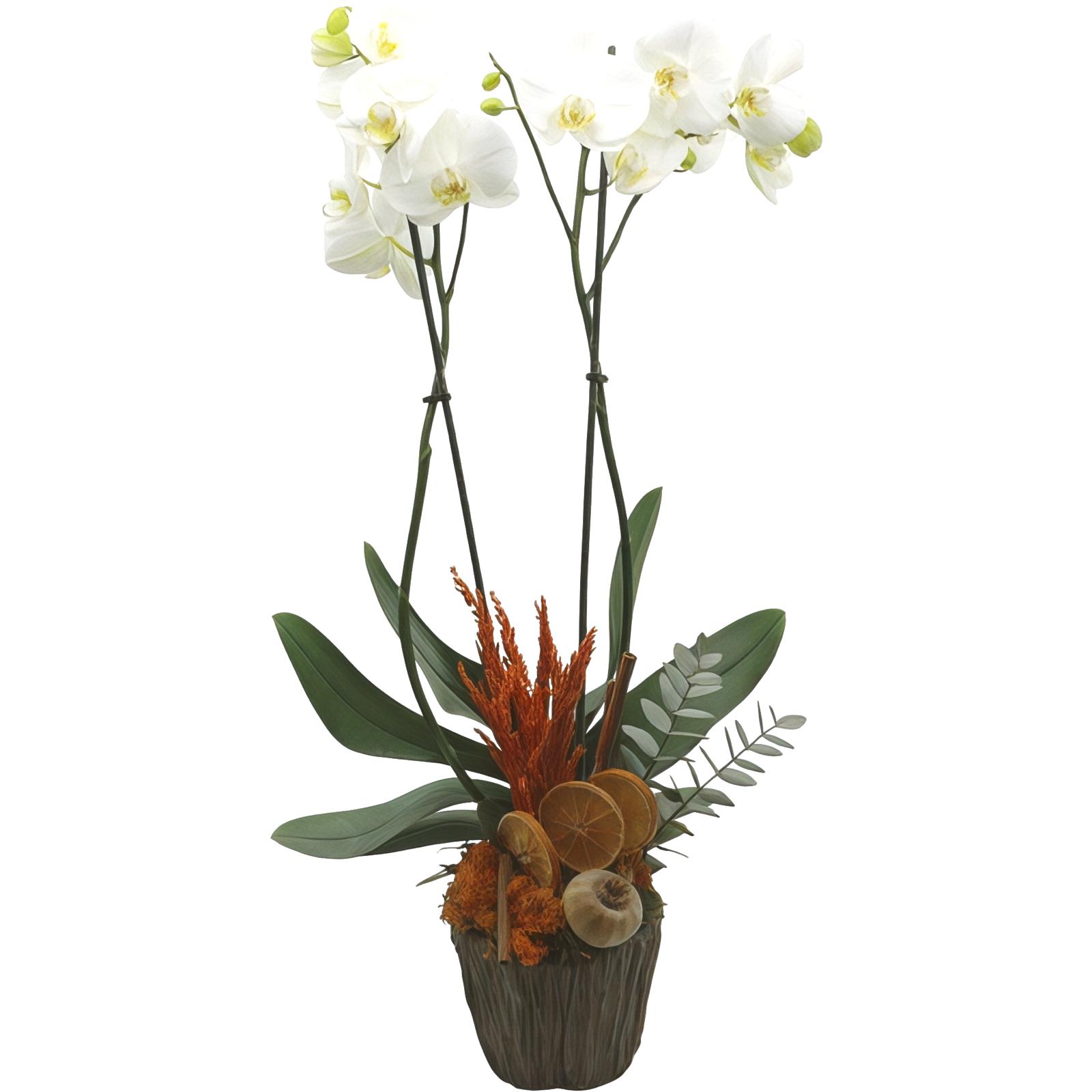 Zamansız güzelliği ve asil duruşuyla beyaz orkide, sevdiklerinize sunabileceğiniz en zarif hediyelerden biri! İki dallı Phalaenopsis beyaz orkide, doğal kuru çiçekler, tarçın çubukları ve kurutulmuş portakal dilimleriyle süslenerek özel bir tasarıma dönüştü. Doğal taş görünümlü dekoratif saksısı, orkidenin şıklığını tamamlayarak ev ve ofisler için mükemmel bir atmosfer oluşturur.