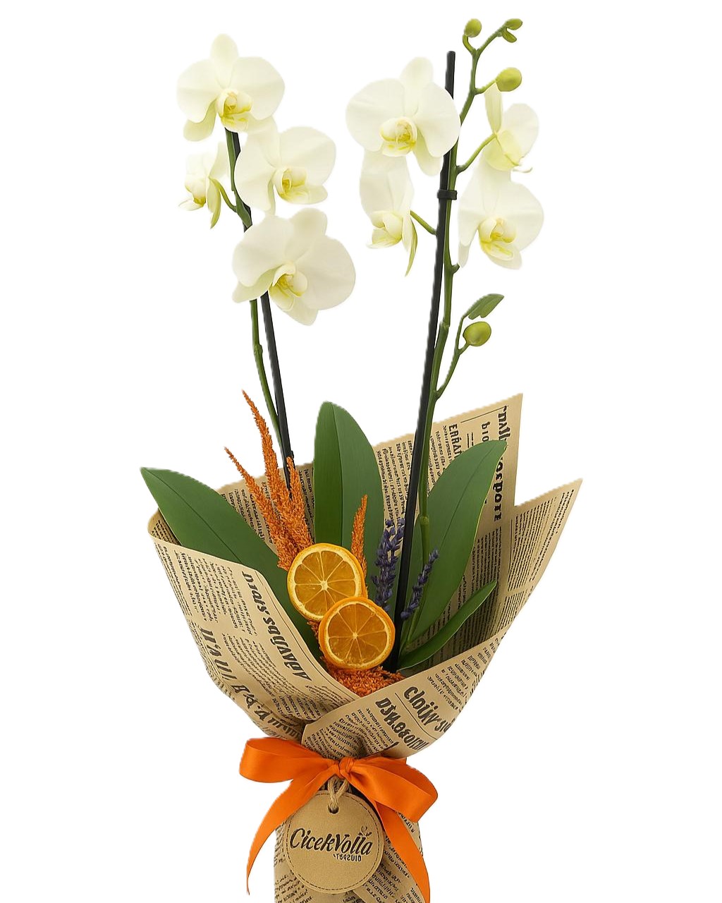 Doğanın en zarif çiçeklerinden beyaz orkide, doğal süslemelerle bir araya gelerek şıklığı ve zarafeti bir arada sunuyor. Gazete kağıdı ambalajı, kurutulmuş portakal dilimleri ve sarı süslemeler ile özenle tasarlanmış bu buket, zarif yapısıyla her ortamı aydınlatıyor. Beyaz orkidenin sade güzelliği, doğal dokularla desteklenerek modern bir hava yaratıyor.