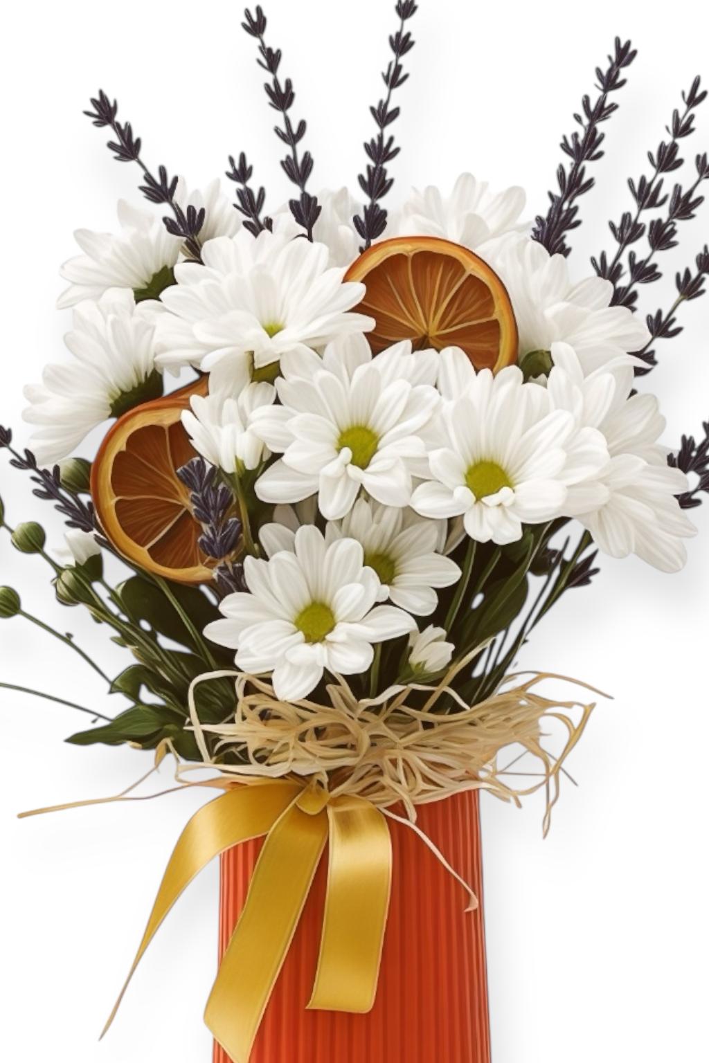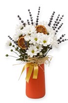 Beyaz papatyaların zarifliği, lavantanın huzur verici kokusu ve kurutulmuş portakal dilimlerinin doğal şıklığıyla hazırlanmış bu özel aranjman, kırmızı modern vazo içinde sunuluyor. Doğal saman detayı ve altın sarısı kurdele ile tamamlanan tasarım, hem dekoratif hem de anlamlı bir hediye seçeneği sunuyor. Özellikle doğum günü, teşekkür, geçmiş olsun ya da ev/ofis dekorasyonu için ideal bir tercih olacaktır.
