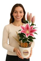 Şıklığın ve zarafetin sembolü olan lilyumlar, bu özel aranjmanda beyaz seramik saksı içinde hayat buluyor. Ferah kokusu ve yumuşak pembe tonlarıyla ortamınıza doğal bir şıklık katacak bu aranjman; kurutulmuş portakal dilimleri, kuru otlar ve mevsim yeşillikleriyle tamamlanarak hem modern hem de doğal bir atmosfer sunar.