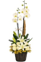 Özel Saksı içerisinde 2 dal beyaz renk orkide, sarı cibso kuru dallar ve beyaz lilyum bulunmaktadır. Orkide Aydınlık bir ortamda bulunmalıdır. Klimalı yerlerden uzak durmalıdır. Ev ve İş ortamınıza doğallık ve şıklık katacak bir tasarımdır. Orkide yaklaşık 60cm'dir. saksı uzunluğu 25x10 cm'dir.