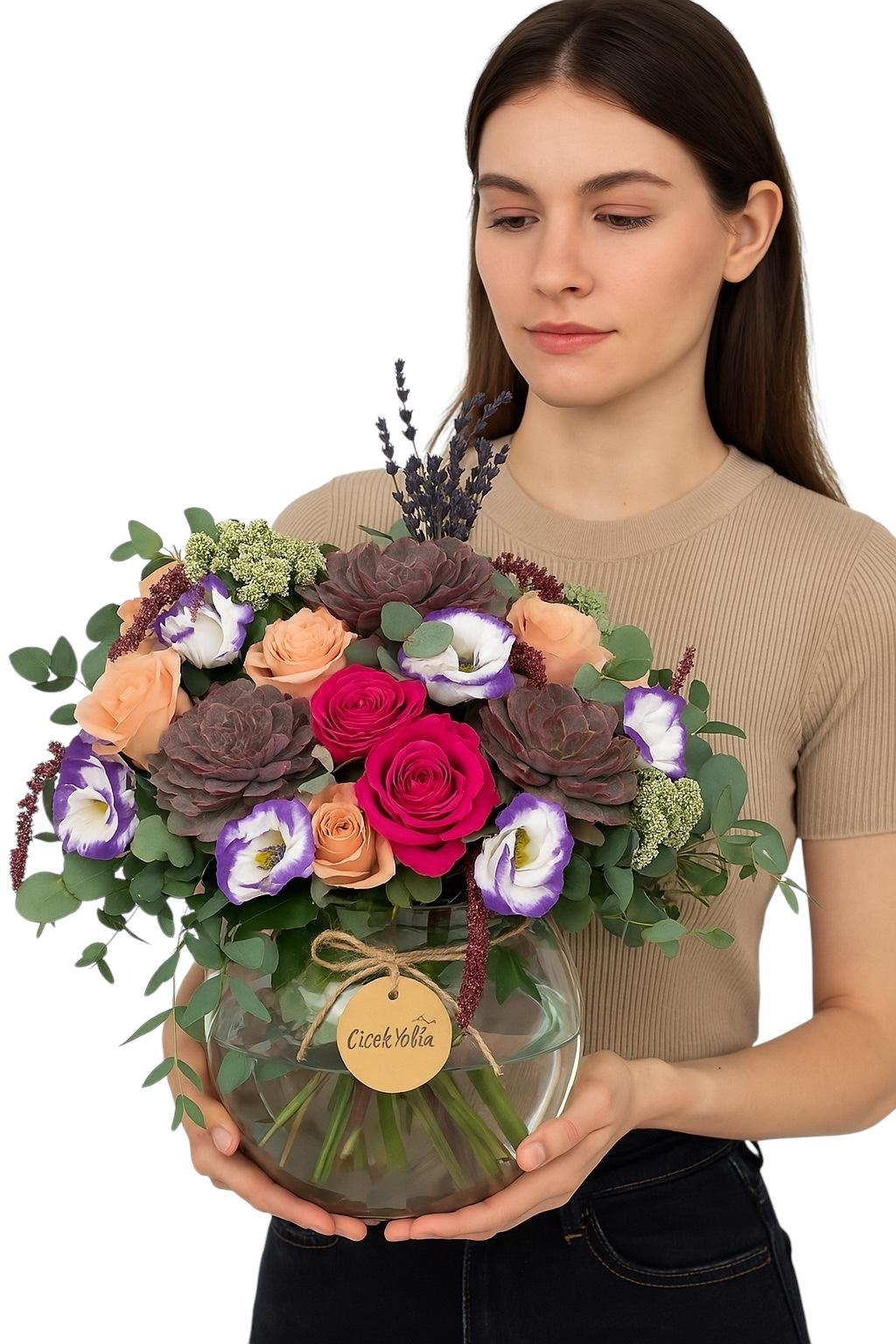 Bordo sukulentler, şeftali ve fuşya güller, lisianthus ve lavanta gibi özel çiçeklerle tasarlanan bu cam fanus aranjmanı; doğallığı, estetiği ve zarafeti bir arada sunar. Mor ve pembe tonların romantizmini taşıyan bu ürün, hem ev dekorasyonu hem de özel gün hediyesi olarak dikkat çeker. İstanbul içi aynı gün teslimat avantajı ile Çiçek Yolla farkıyla sunulur.