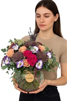 Cam fanus formunda hazırlanan bu zengin ve sofistike aranjman, iri bordo sukulentler, şeftali tonlu güller, fuşya güller, mor-beyaz lisianthuslar, okaliptus yaprakları ve lavanta dallarıyla harmanlanmıştır. Eşsiz bir renk kontrastı sunan bu özel aranjman, hem modern hem de romantik bir görünüme sahiptir. Ferah cam saksı, çiçeklerin tüm detaylarını şeffaflıkla ortaya koyarken, aranjmanın tamamı zarafet ve stil dolu bir sunum oluşturur. Ürün yaklaşık 35 cm genişliğinde ve 30-32 cm yüksekliğindedir.