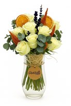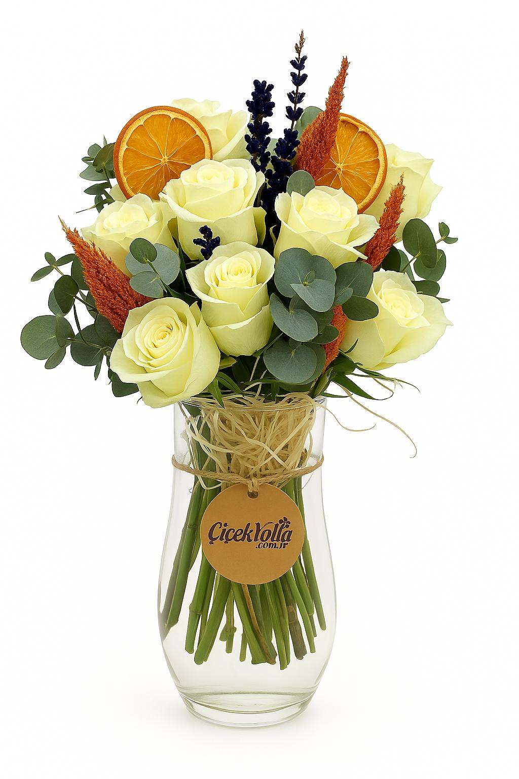 Sadeliğin içindeki zarafeti temsil eden bu özel tasarım, cam vazo içerisinde sunulan krem tonlarındaki güllerle doğallığın ve şıklığın buluşma noktası. Aranjmanda yer alan lavanta dalları, kuru portakal dilimleri, turuncu laguruslar ve eukaliptus yapraklarıyla zenginleştirilen görünüm, hem taze hem de rustik bir atmosfer yaratıyor. Çiçek Yolla’nın doğal ipli etiketi ve rafya bağlamasıyla tamamlanan bu özel tasarım, doğum günü, teşekkür, geçmiş olsun ya da “seni düşündüm” demek için zarif ve etkileyici bir tercih sunuyor.