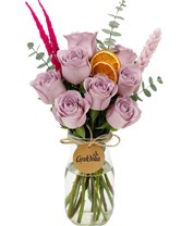 Cam silindir vazo içerisinde 9 adet lila gül, kuru portakal dilimi, okaliptus yaprakları, pembe kuru çiçekler ve lavanta tonlarında tüy bitkilerle tamamlanmıştır. Vazonun ağız kısmı doğal saman ip ile bağlanmış, üzerine yuvarlak kraft etiket üzerine “Çiçek Yolla” logosu işlenmiştir. Sadelik ve şıklığı bir arada sunan bu aranjman, zarif görünümüyle bulunduğu her ortamda dikkat çeker.