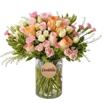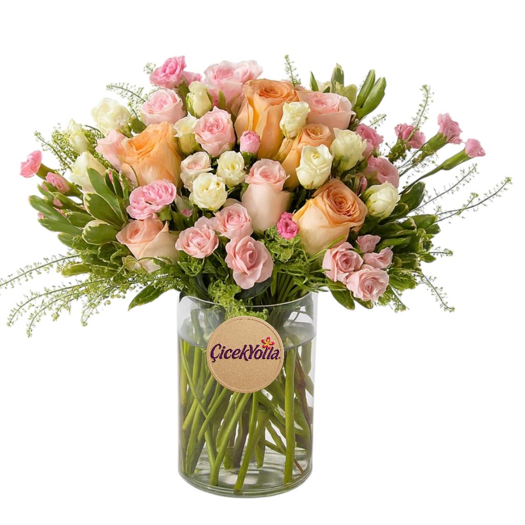 Pastel tonlardaki bu şık çiçek aranjmanı, cam vazo içinde özenle hazırlanmıştır. İçeriğinde şeftali tonlarında gül, krem mini güller, uçuk pembe sprey güller, beyaz lisyantus ve zarif yeşil dokular yer alır. Tamamı yaklaşık 40-45 cm yüksekliğindedir. Bu ürün; romantik ve samimi bir mesaj vermek isteyenlerin tercihi olacak zarafettedir.