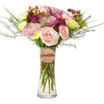 Şeffaf ve ince formda cam vazoda sunulan bu özel aranjman; 3 adet pembe gül, pembe krizantem, sarı karanfil, hiperikum meyveleri, mor limonyum ve doğal yeşilliklerle oluşturulmuştur. Renk geçişleri yumuşak, enerjisi romantiktir. Yaklaşık 40-45 cm yüksekliğe sahip olan bu aranjman; hem özel günlerde hediye hem de sade dekoratif sunum olarak tercih edilebilir