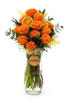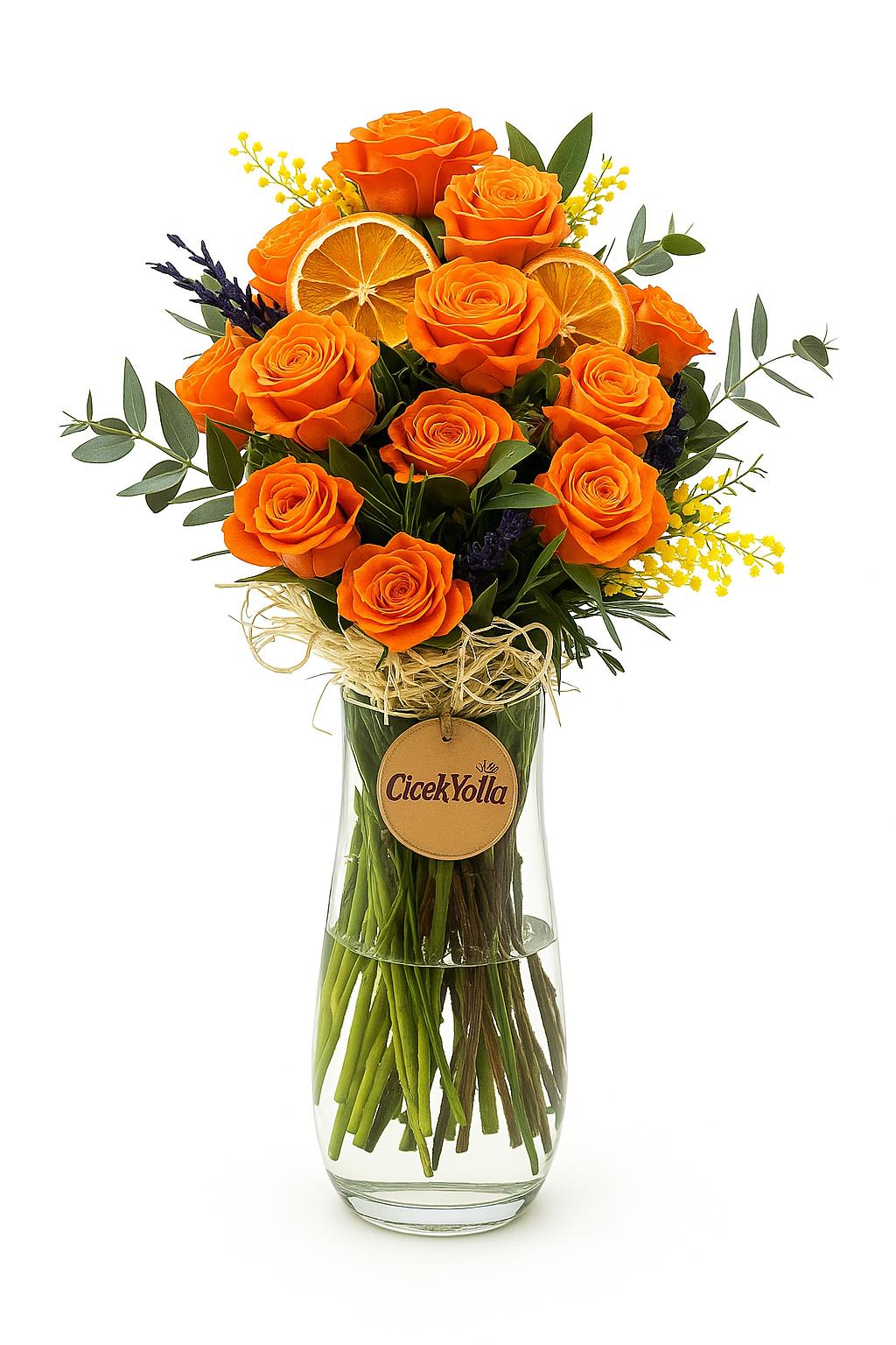 Canlı ve enerjik yapısıyla dikkat çeken “Turuncu Zarafet” aranjmanı, cam vazo içerisinde zarif bir sunumla hazırlanan turuncu güllerin göz alıcı etkisini yansıtıyor. Etrafını saran kuru lavanta, kuru portakal dilimi, sarı mimoza dalları ve eukaliptus yaprakları, aranjmana hem doğallık hem de ferahlık katıyor. Cam vazonun içinden görünen saplar ve rafya detayları, buketin rustik havasını tamamlıyor. Turuncunun sıcak tonları, moral verici etkisiyle doğum günü, teşekkür veya “seni düşündüm” demek için mükemmel bir seçim sunuyor. Doğal görünüm, sade şıklık ve enerji dolu bir mesaj bu aranjmanda bir arada!