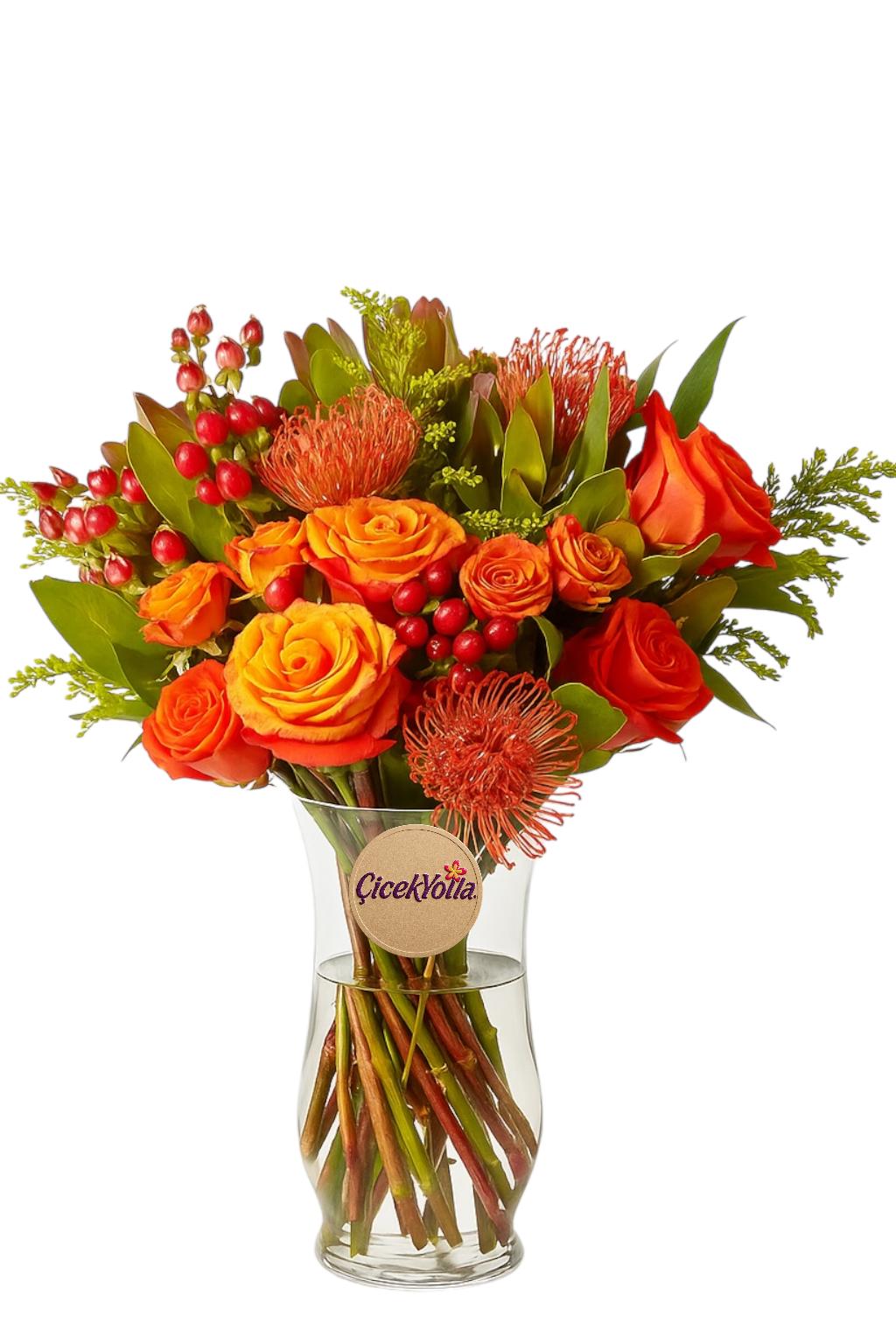Bu cam vazoda sunulan özel aranjman; turuncu güller, hiperikum meyveleri, protea çiçekleri (turuncu iğneli formda) ve doğal yeşilliklerle tropikal bir uyum içinde hazırlanmıştır. Aranjmanın boyu yaklaşık 35-40 cm olup; enerjik renk paleti ve egzotik dokusuyla dikkat çeker. Gün batımını andıran bu tasarım, sevdiklerinize sıcak bir mutluluk sunmak için mükemmel bir seçimdir.