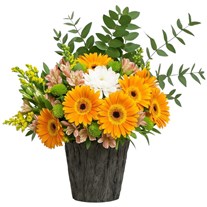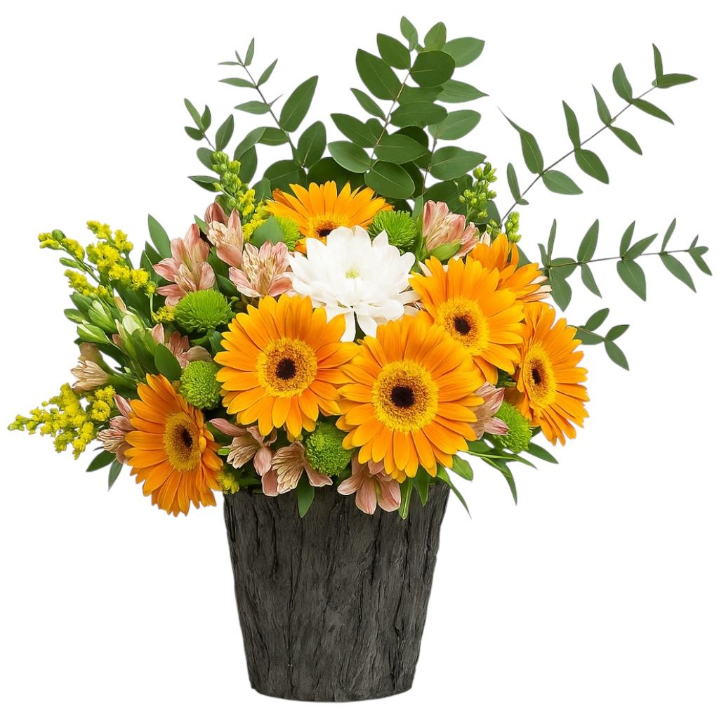 Yaklaşık Ürün Boyutu: 30 cm en özel ve en güzel sunumu bu eşsiz aranjmanda sevdiklerinizi bekliyor. Beton Görünümlü vazo içerisinde Turuncu gerberalar ve papatyaların tatlı buluşması sevdiklerinizin özel günlerine bolca neşe ve mutluluk katacak .Gerbera turuncu : 7 Adet okaliptus Beyaz Papatya : 18 Adet