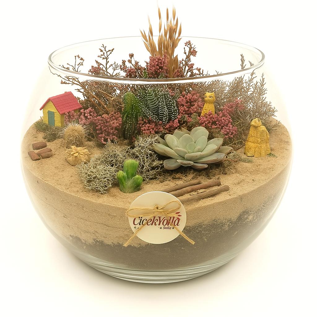- Sukulentler : Canlı ve dayanıklı sukulent bitkiler, teraryumun merkezi yer alarak doğal bir görünüm sunar.