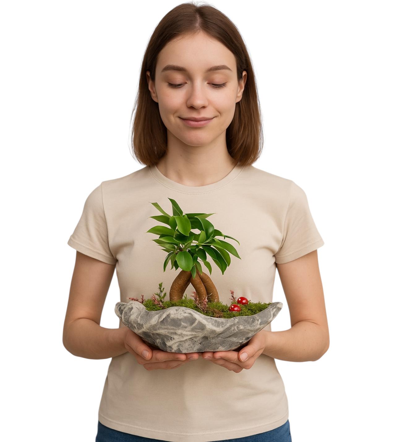 Doğanın huzur veren sadeliğini yansıtan bu dekoratif bitki, özel tasarlanmış doğal taş görünümlü saksısı ve bonsai formundaki estetik yeşil dallarıyla iç mekanlara doğal bir şıklık kazandırıyor. Kök yapısı iki gövde şeklinde birleşen bu bitki, minimal dokunuşlarla hazırlanmış minyatür mantar ve yosun detaylarıyla tamamlanmıştır.