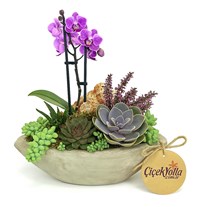 İki dallı mini mor Phalaenopsis orkide ile farklı türlerde sukulentlerin doğal taşlar, yosun dokuları ve kuru lavantalarla uyum içinde sunulduğu özgün bir tasarım. Beton görünümlü, oval formda dekoratif saksı içinde yer alan bu aranjman, doğallığın ve modernliğin birleşimini yansıtıyor. Her bir bitki, canlı ve estetik dokusouyla dikkat çekerken, aranjmanın ön kısmında jüt iple bağlanmış “Çiçek Yolla” logolu kraft etiket yer almakta.