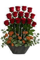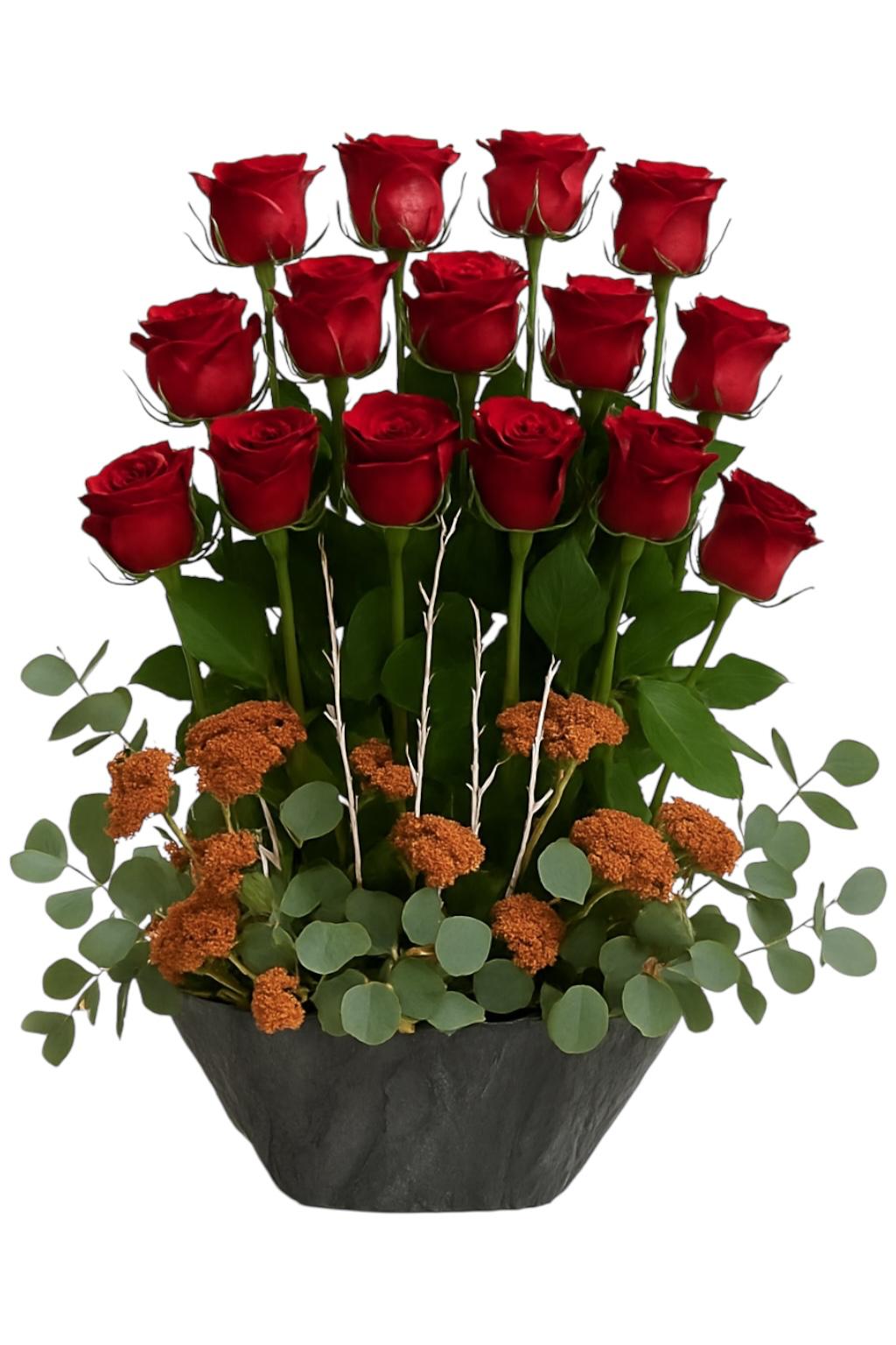 Özel Taş Saksı Görünümlü vazo İçerisinde 20 adet kırmızı evered güllerden oluşan okaliptus yaprağı kurutulmuş stabil kırmızı kuru çiçeklerle dizayn edilmiş ortalama yüksekliği 40cm genişliği 25 cm olan canlı Fiorabella Kırmızı Gül Dizaynı.