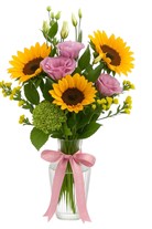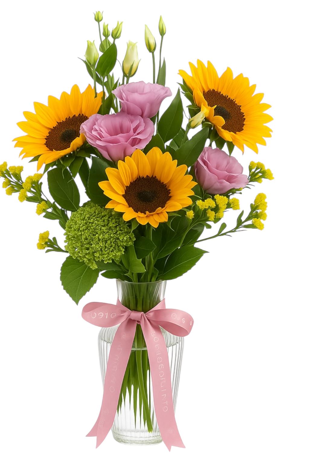 Parlak günebakan çiçeklerinin, pembe lisyantus ve yeşil ortancalarla buluştuğu cam vazo aranjmanı. Sade çizgili vazo ve pembe kurdele detaylı bu tasarım; enerji dolu, zarif ve modern bir dokunuş sağlar.