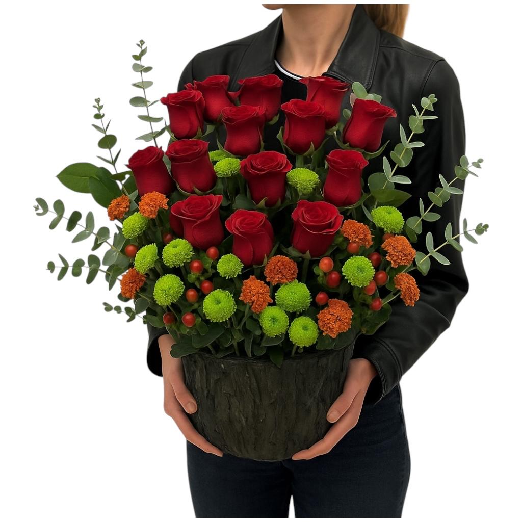 Hildemara Özel Taş Saksı Görünümlü vazo İçerisinde 19 adet 1.kalite kırmızı evered güllerden oluşan okaliptus yaprağı kurutulmuş stabil kırmızı kuru çiçeklerle dizayn edilmiş ortalama yüksekliği 40cm genişliği 25 cm olan canlı Fiorabella Kırmızı Gül Dizaynı.