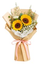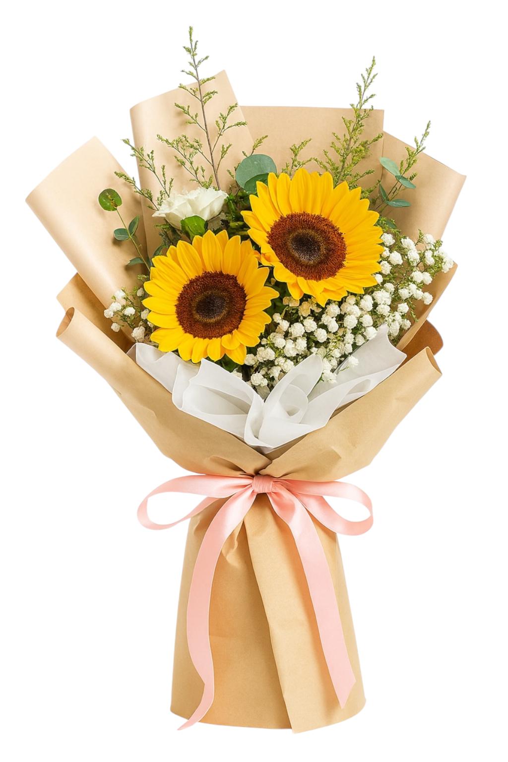 Parlak sarı ayçiçeklerinin beyaz cipsofilya bulutları ve yeşil dolgu yapraklarıyla bir araya geldiği bu neşeli buket; kraft kâğıt sarımı ve pembe kurdelesiyle sıcak, doğal bir hediye alternatifi.