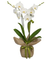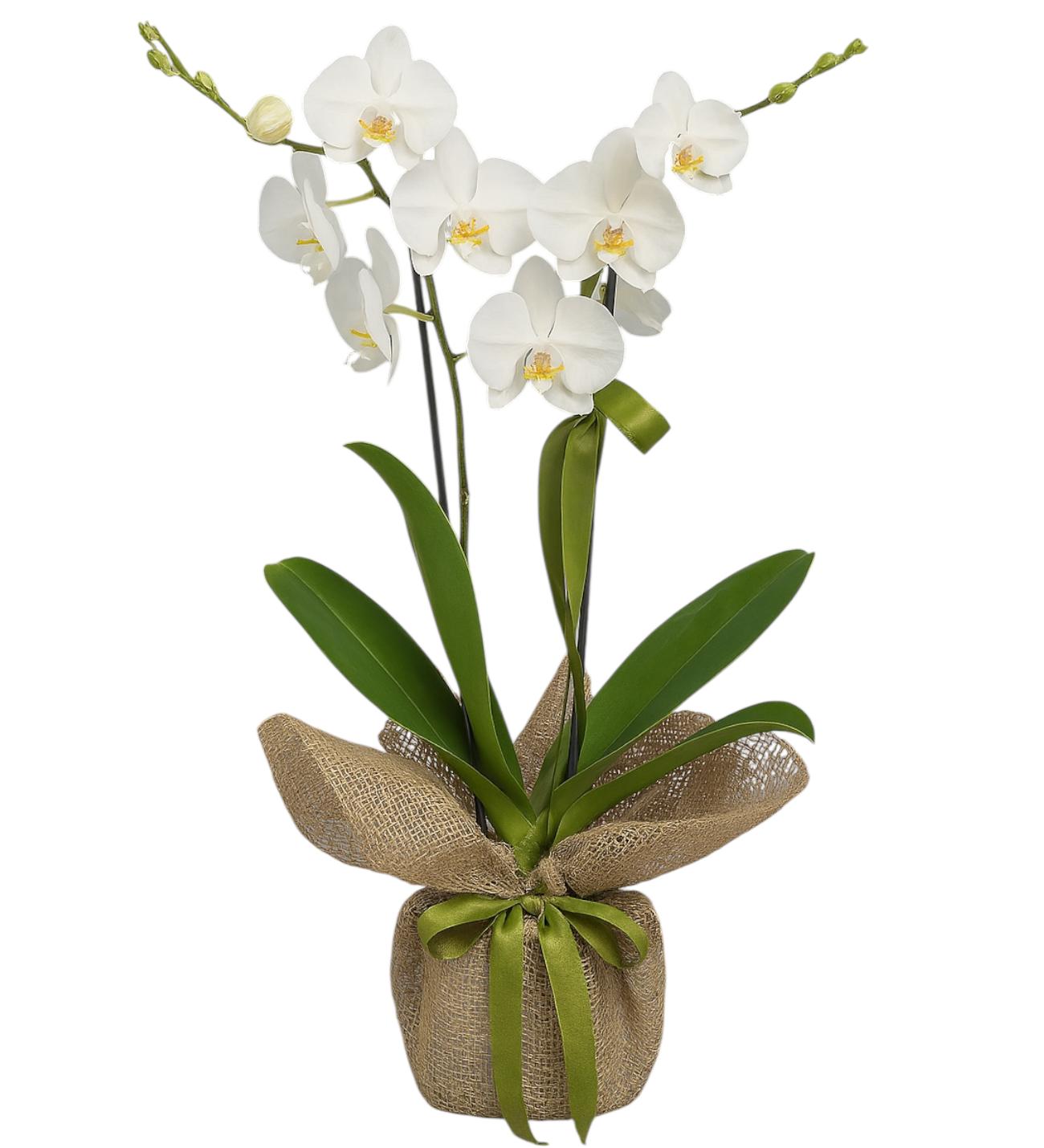 Zarafetin simgesi beyaz Phalaenopsis orkide, doğal jüt kumaş ve yeşil kurdele ile özenle süslendi. Minimal ve şık tasarımıyla hem hediye hem de ev/ofis dekorasyonu için mükemmel bir seçim.