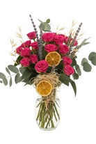 Ferahlatıcı lavanta, doğal portakal dilimleri ve zarif pembe güllerle hazırlanmış bu şık aranjman, her ortamda fark yaratacak. Çiçeklerin doğal güzelliği, modern şeffaf cam vazo ve ip detaylarıyla tamamlanırken, okaliptus yaprakları ve kuru başaklarla tasarıma dokulu bir estetik katılmıştır. Taze gül kokusunun lavanta ile birleştiği bu özel aranjman, doğum günü, tebrik, geçmiş olsun ve özel günler için mükemmel bir hediye seçeneği sunuyor.