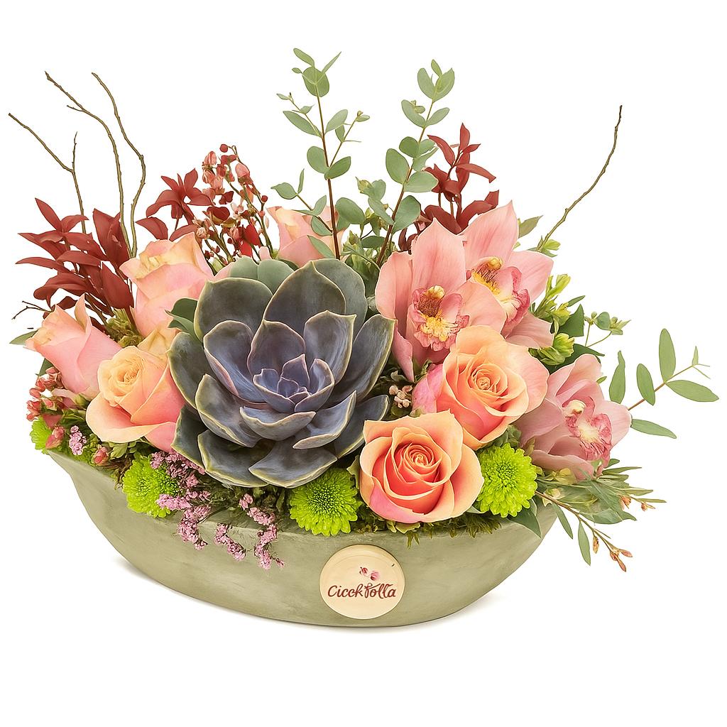“Pembe güllü sukulent aranjmanı, zarafetin, şıklığın ve doğanın güzelliğinin birleşimini sunar. Pembe gül, sevginin, nezaketin ve zarafetin sembolü olarak bilinirken, sukulent ise dayanıklılığı ve özgünlüğü temsil eder. Bu özel aranjman, pembe güllerin romantik etkisini, sukulentlerin sakin ve zarif görünümüyle birleştirir. Her bir pembe gül, sevginin ve tutkunun izlerini taşırken, sukulentler ise dayanıklılığı ve sürekliliği simgeler. Bir araya geldiklerinde, bu iki çiçek türü, doğanın güzelliklerini ve sevginin derinliğini yansıtır. Pembe güllü sukulent aranjmanı, evinize zarif bir dokunuş katarken, sevdiklerinize duygusal bir mesaj iletmek için ideal bir seçenektir. Romantik bir hediye arayanlar için mükemmel bir tercihtir ve sevdiklerinizi mutlu edecek özel bir armağandır.”