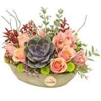 - Beton görünümlü saksı içerisine özenle yerleştirilen çiçeklerden oluşan bu aranjman, bulunduğu ortamı zenginleştirir.