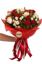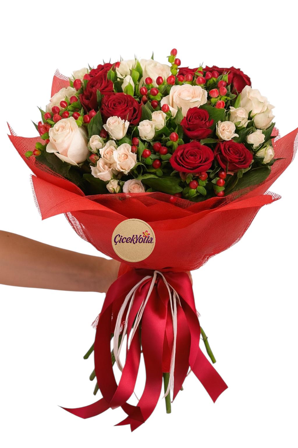 Kırmızı tül ambalajla sarmalanmış bu özel buket; yaklaşık 8 adet kırmızı gül, 7 adet somon tonlarında sprey gül, beyaz gül detayları, hiperikum meyveleri ve taze yeşilliklerle zenginleştirilmiştir. Aşkın tutkusu ve yumuşak zarafeti tek aranjmanda buluşuyor. Buketin boyu yaklaşık 40-45 cm’dir. Sevgiliye sunulacak en anlamlı jestlerden biridir.