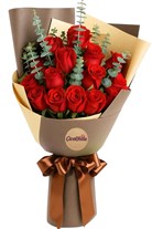 Canlı kırmızı güllerin, okaliptus dallarıyla buluştuğu, kahverengi kraft kâğıt ve saten kurdeleyle şık bir şekilde sarıldığı bu buket; zarif, klasik ve etkileyici bir hediye seçeneğidir.