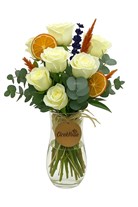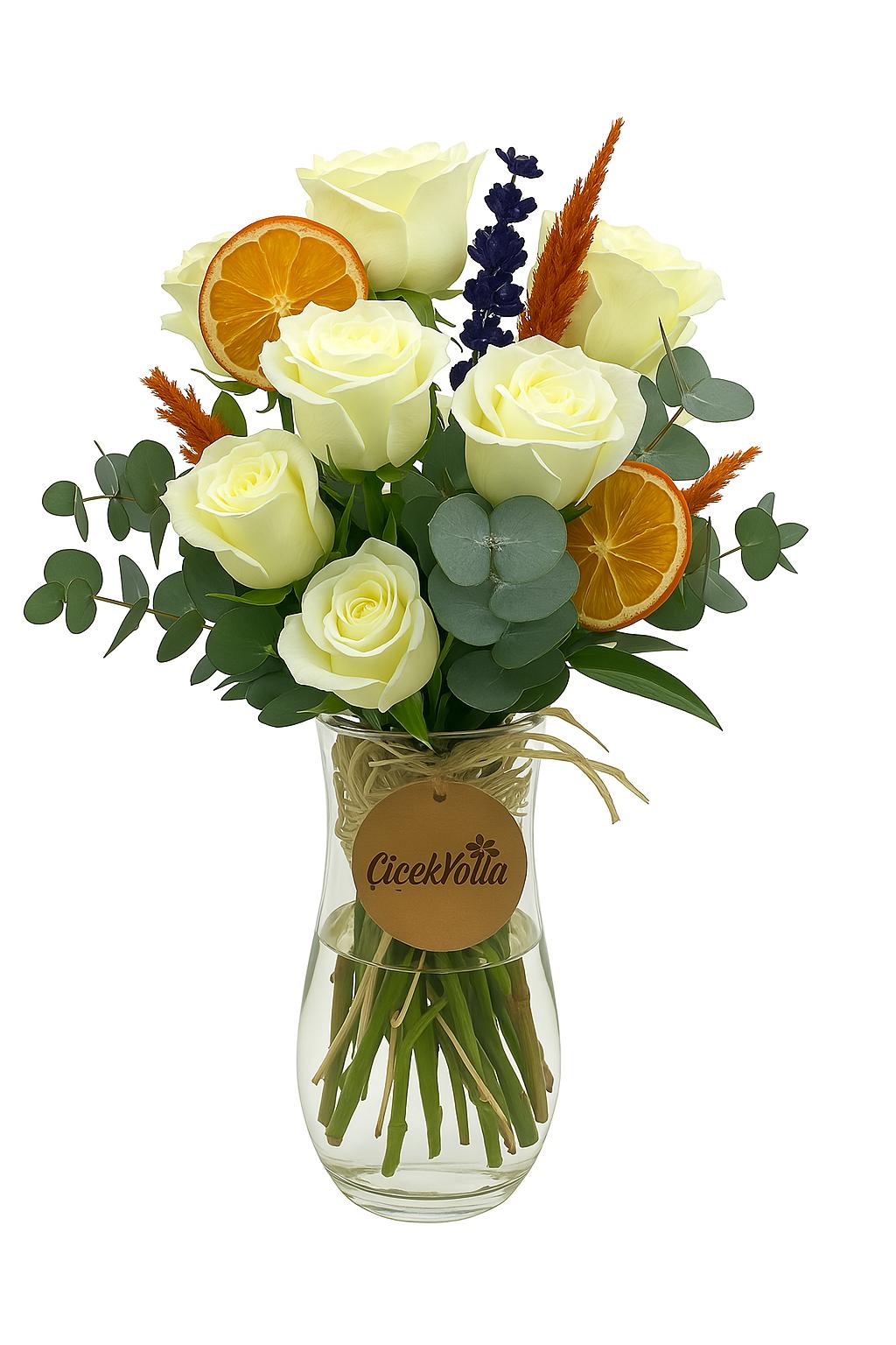 Doğallığın zarafetle buluştuğu bu özel aranjman, ferahlatıcı görünümü ve canlı detaylarıyla her ortama pozitif enerji katıyor. Yüksek kaliteli cam vazo içerisinde yer alan krem tonlarındaki 7 adet gül, sade şıklığı temsil ederken; lavanta, kuru turuncu dilimler ve turuncu lagurus dalları aranjmana özgün bir dokunuş katıyor. Eukaliptus yapraklarının ferah kokusu, bu aranjmana hem görsel hem duyusal bir zenginlik sunuyor. Çiçek Yolla’nın naturel ipli etiketiyle tamamlanan bu tasarım, doğallığı ve estetiği bir arada sevenler için mükemmel bir seçimdir. Doğum günü, teşekkür, geçmiş olsun dileği veya iş tebriği için zarif ve akılda kalıcı bir hediye alternatifi sunar.