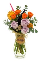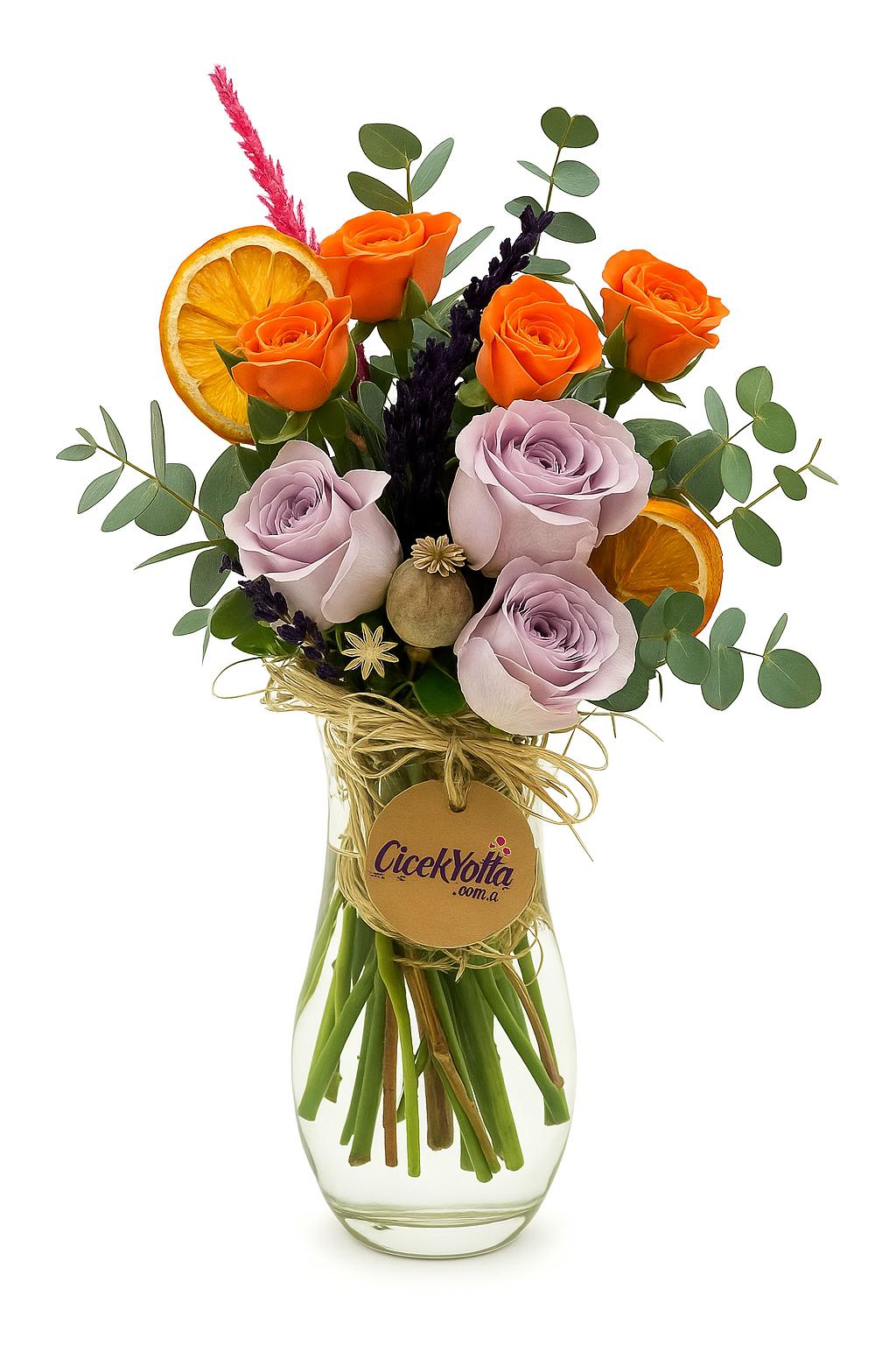 Zıt renklerin zarif uyumundan doğan bu eşsiz aranjman; lavanta tonlarında lila güllerle canlı turuncu gülleri bir araya getiriyor. Kuru lavanta, portakal dilimleri, haşhaş kapsülleri ve yıldız çiçekleriyle doğallık tamamlanıyor. Cam vazonun içindeki sade su dokusu, çiçeklerin tazeliğini ön plana çıkarırken, dışındaki doğal iple bağlanmış “Çiçek Yolla” etiketi tasarıma rustik bir zarafet katıyor. Hem özel günler hem de dekoratif kullanım için benzersiz bir seçim.