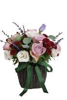 Lila ve pembe güllerin beyaz lisyantus ve bordo pompon krizantemlerle buluştuğu; lavanta dalları ve okaliptus yapraklarının eşlik ettiği romantik aranjman. Siyah, dokulu saksı ve yeşil kurdele detayıyla modern ve zarif bir hediye alternatifi.