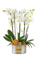 Beyazın en saf haliyle sunulduğu bu görkemli aranjman, tam 4 dallı beyaz Phalaenopsis orkideden oluşur. Gümüş tonlarındaki özel silindirik saksı içinde yer alan tasarım; kurutulmuş lavanta, portakal dilimi, tarçın ve dekoratif yeşilliklerle tamamlanarak hem zarif hem de modern bir atmosfer yaratır. Her bir dal, doğallığını koruyan rafya kurdelelerle bağlanmış ve Çiçek Yolla’nın naturel etiket dokunuşuyla taçlandırılmıştır. Bu şık aranjman; iş kutlamaları, terfi tebrikleri, ev hediyeleri veya ofis dekorasyonları için ideal olduğu kadar, zarif bir doğum günü ya da özel gün hediyesi olarak da eşsiz bir seçenektir.