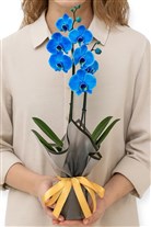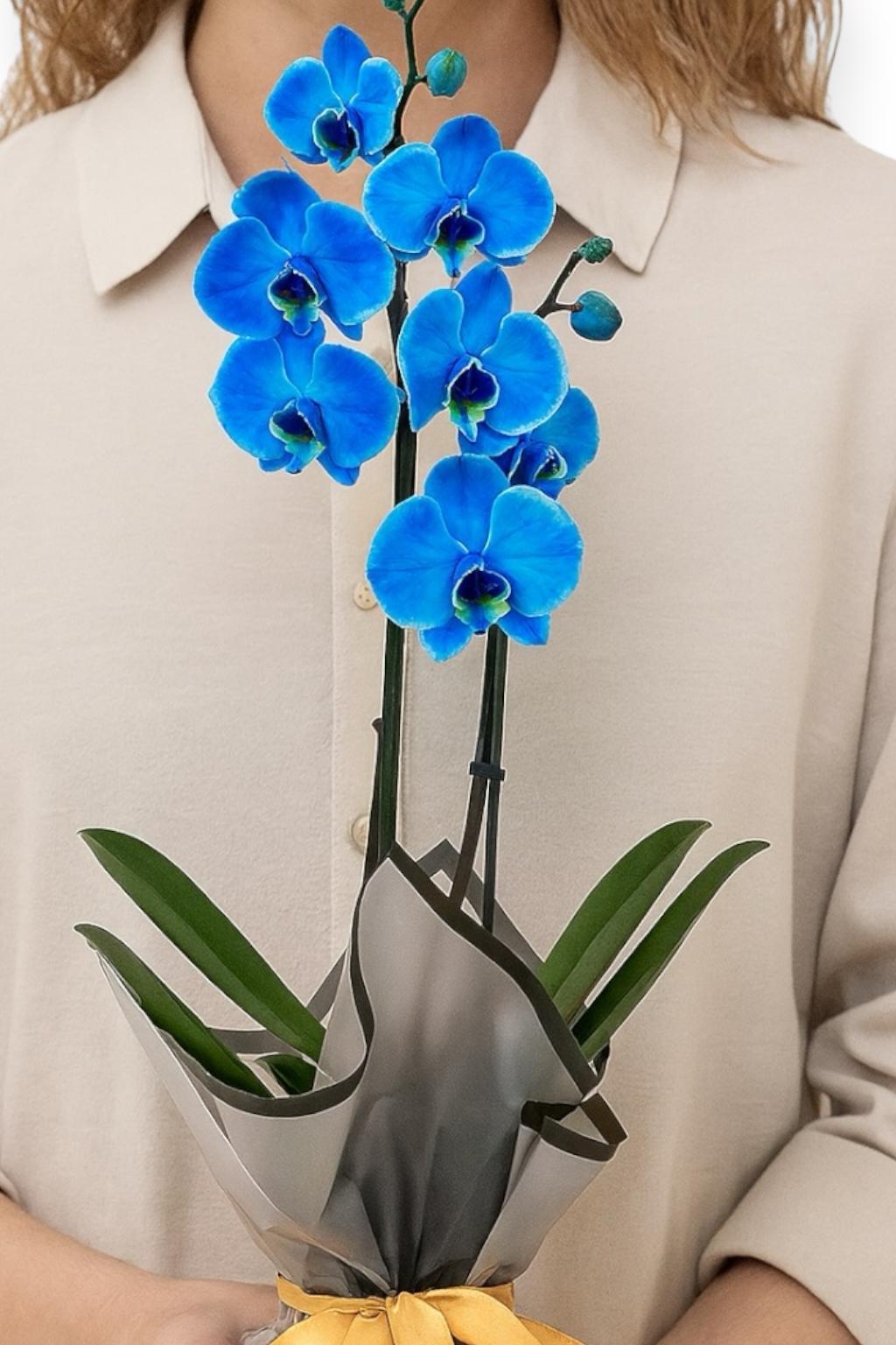 Doğanın en nadide renklerinden biri olan maviyle büyüleyen bu çift dallı canlı orkide, zarafeti ve asaleti bir araya getiriyor. Şeffaf saksıda topraklı ve köklü şekilde gelen bu orkide, uzun ömürlü olmasıyla sevdiklerinizin günlerini aydınlatacak bir hediye seçeneğidir. Mat siyah ambalaj ve sarı kurdele detayıyla hem sade hem de şık bir sunum oluşturulmuştur.